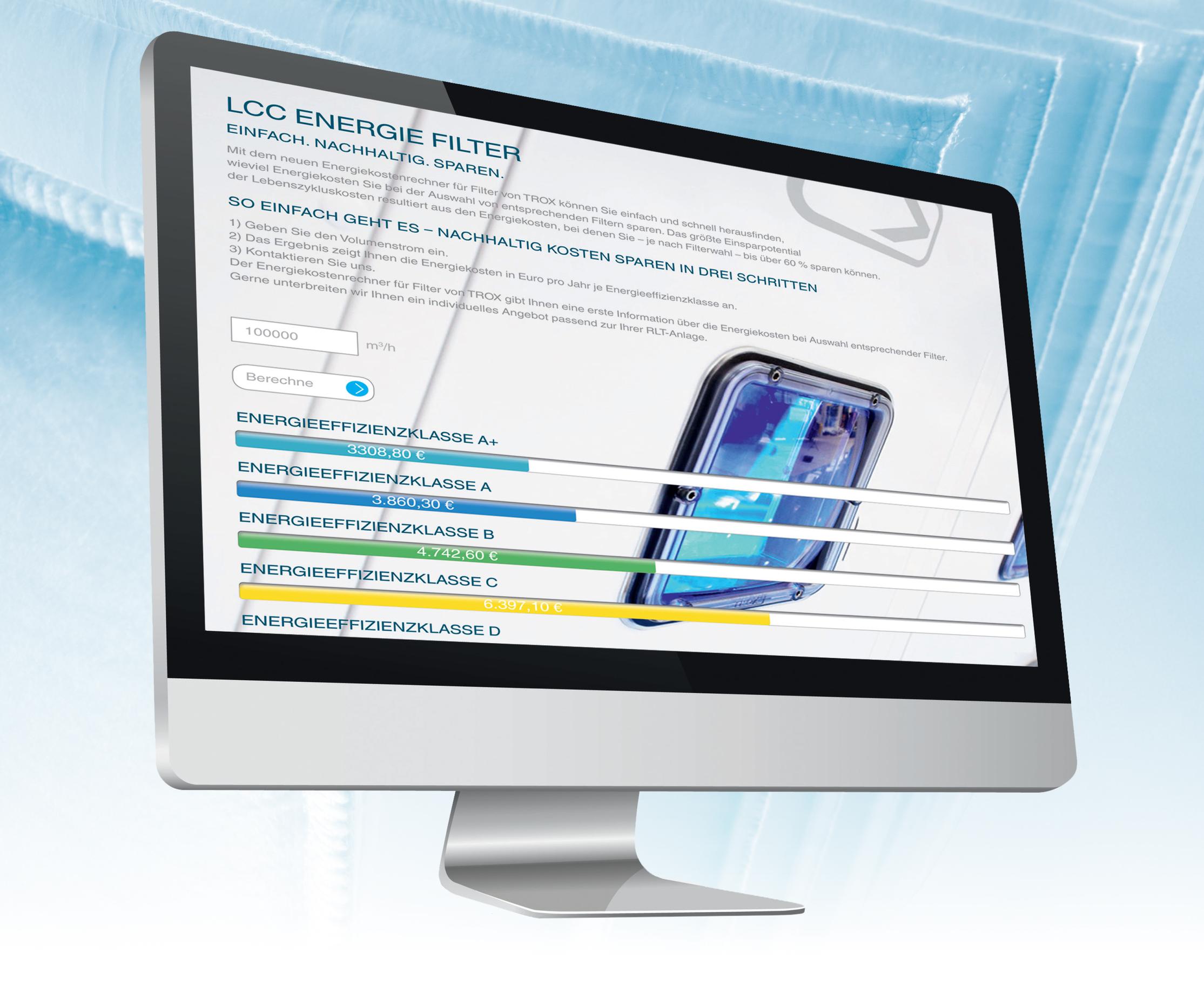 TROX hat für die Wirtschaftlichkeitsberechnung von Feinstaubfiltern ein Life-Cycle-Cost-(LCC)-Tool auf Basis der strengen Energieeffizienz-Klassifizierung nach Eurovent erstellt. Kunden haben die Möglichkeit, mit Hilfe ihrer individuellen Nutzungsdaten das Filter zu wählen, welches vergleichend mit anderen Filtern die höchste Wirtschaftlichkeit unter Berücksichtigung der Investitions-, Energie-, Wartungs- und Entsorgungskosten aufweist.